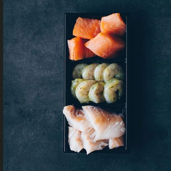 Bakje met zalm, kabeljauw en gamba's